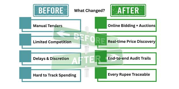 Automated workflows (RFQs, e-bidding, reverse auctions, e-contracts) dramatically shorten cycle times compared with manual tendering, enabling agencies to deliver services and projects faster — which scales meaningfully when the platform is handling ₹lakh-crore level annual spend.